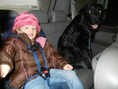 Also, the other day I went to pick up Jacey from preschool. She came out with a folder that was for me and decided she wanted it fiercely. I got it away from her once to lay it on the front chair of the van. Unfortunately she got it while I was quickly visiting with her speech therapist. Go figure! So I had to take it away from her again. This sent her into a lovely meltdown where she straightened her back and her legs so that I couldn't strap her into her carseat, all the while screaming. I eventually got her strapped in but the screaming continued. I took her hand and opened it, against her liking, and allowed Dublin to "kiss" (lick) it. I held it for several seconds in hopes that it would stop the meltdown. It only made her madder. I gave up on it, closed the van door and went around to get into the driver's seat. By the time I sat down in front of the steering wheel, there were giggles coming from the back seat - from Jacey! Apparently, she decided that it was an okay idea to let Dublin "kiss" her hands. She also had lunch on her face that he enjoyed trying to get to. I am sure that without Dublin there, the ride home would have been one of the hundreds of others before - when Jacey would scream the entire ride home.